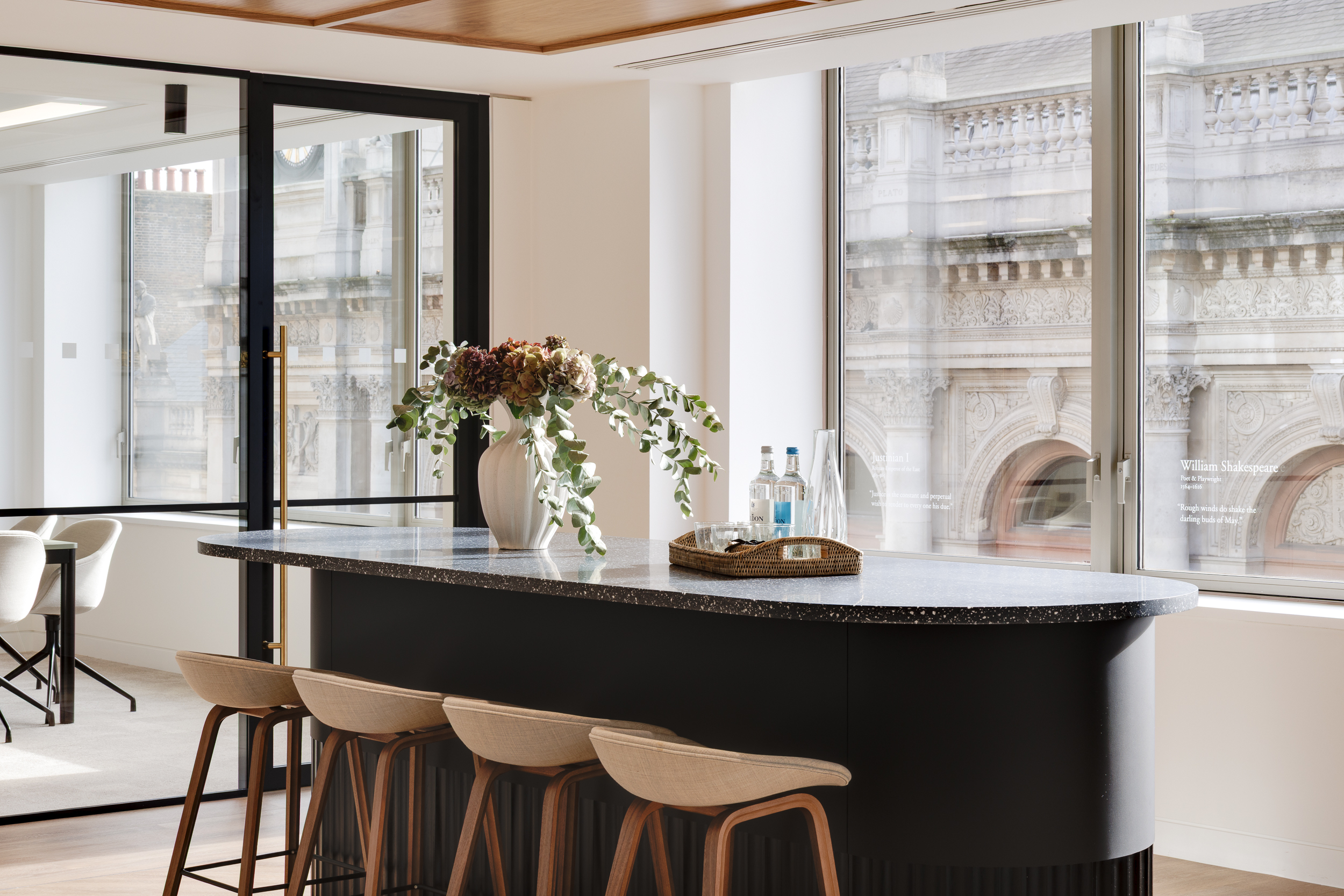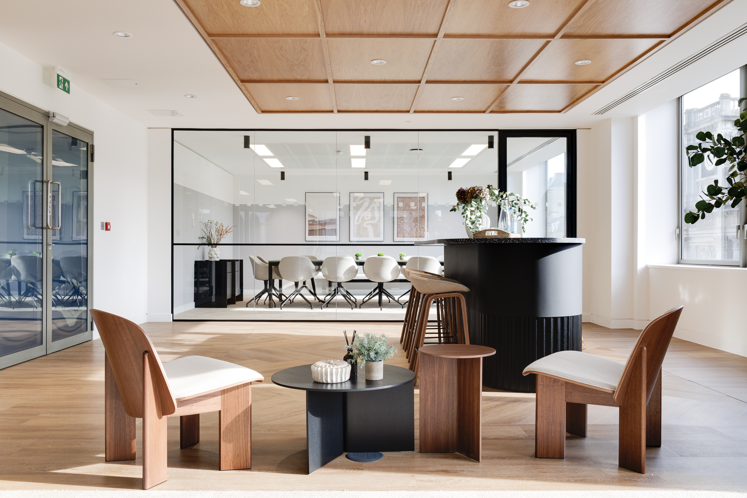 A bespoke timber bar in the welcome area guides visitors forward. On one side of the bar, a two-tone curtain is aligned with the height of the bar, creating a deliberate line of sight that draws the eye straight ahead. That visual rhythm is echoed above and below, where a feature ceiling and patterned flooring converge at the same point. Together, these layers form a subtle tunnel effect that naturally guides visitors towards the office’s heart. The curtain itself adds a layer of adaptability, it can remain open to frame the reception as a social hub or be pulled across to create privacy, even extending the boardroom during larger gatherings.