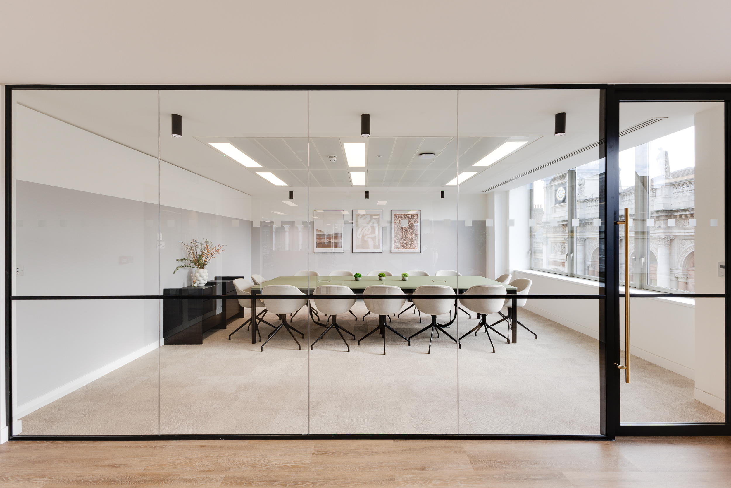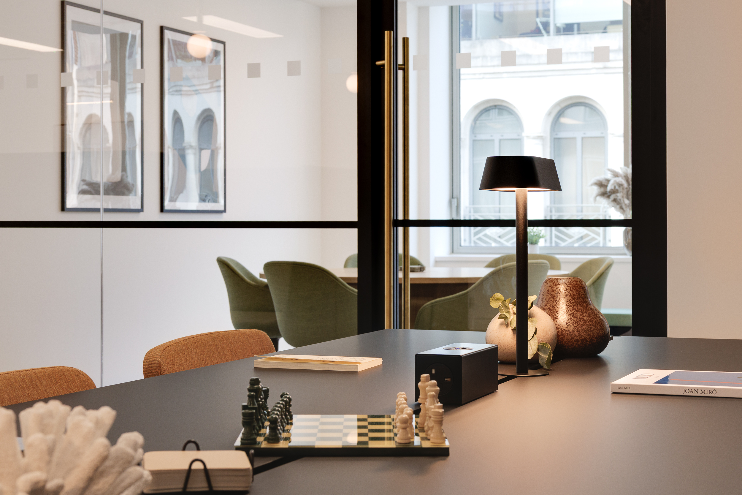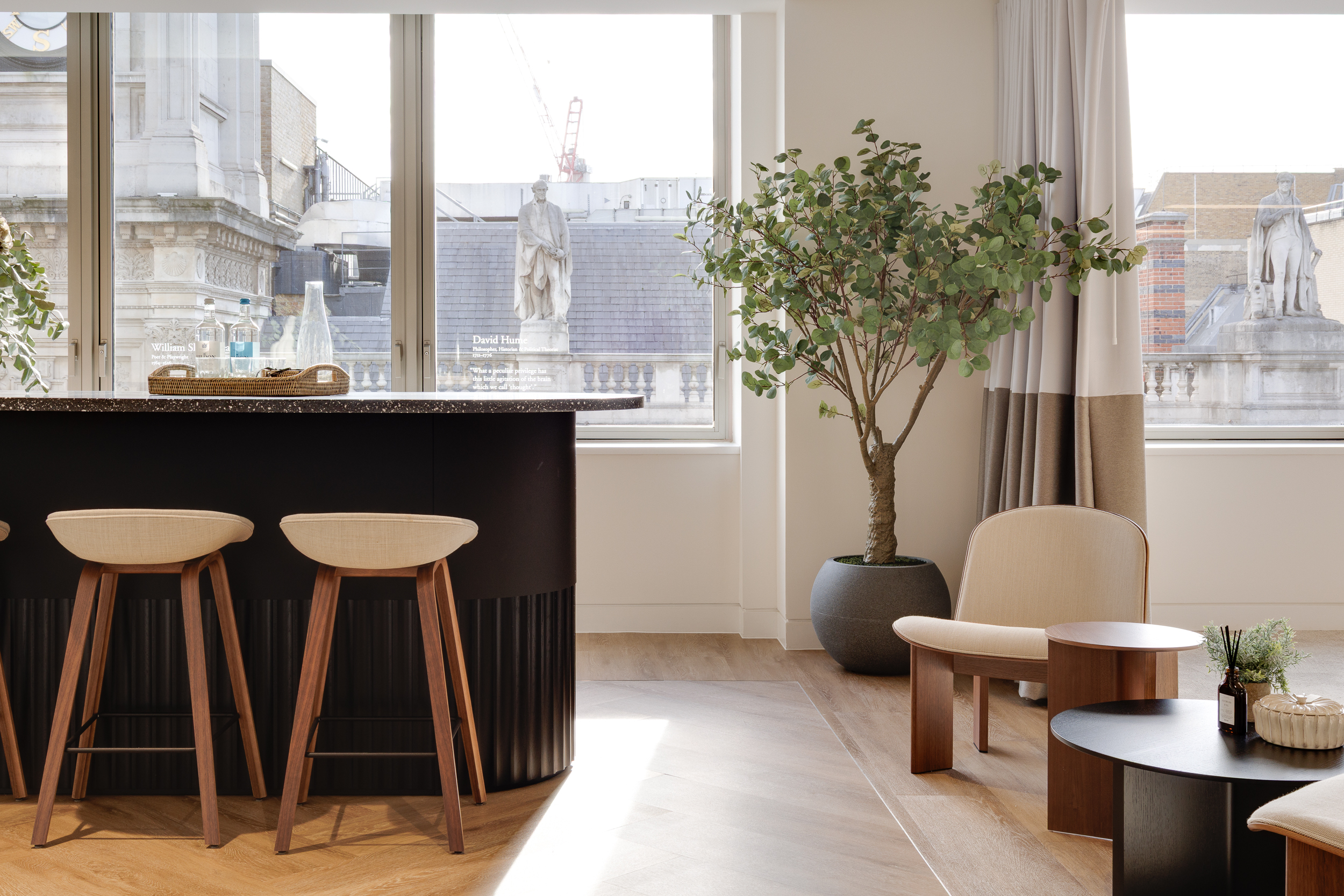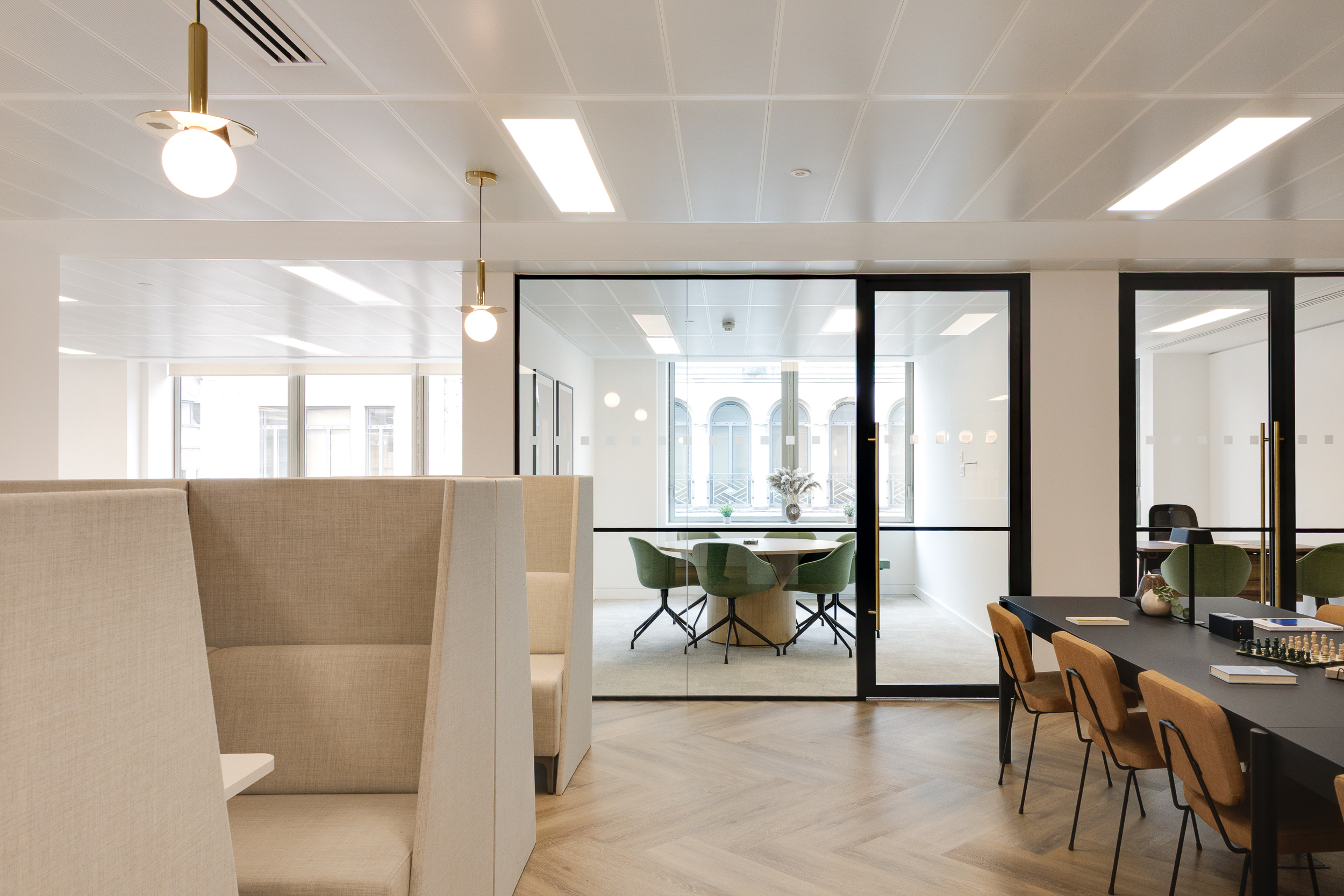 Furniture echoes this approach, blending clean lines and muted tones with occasional bursts of colour that define each setting. The mix of spaces ensures the office can flex with changing tenant demands, while still holding together as a cohesive, characterful workplace.