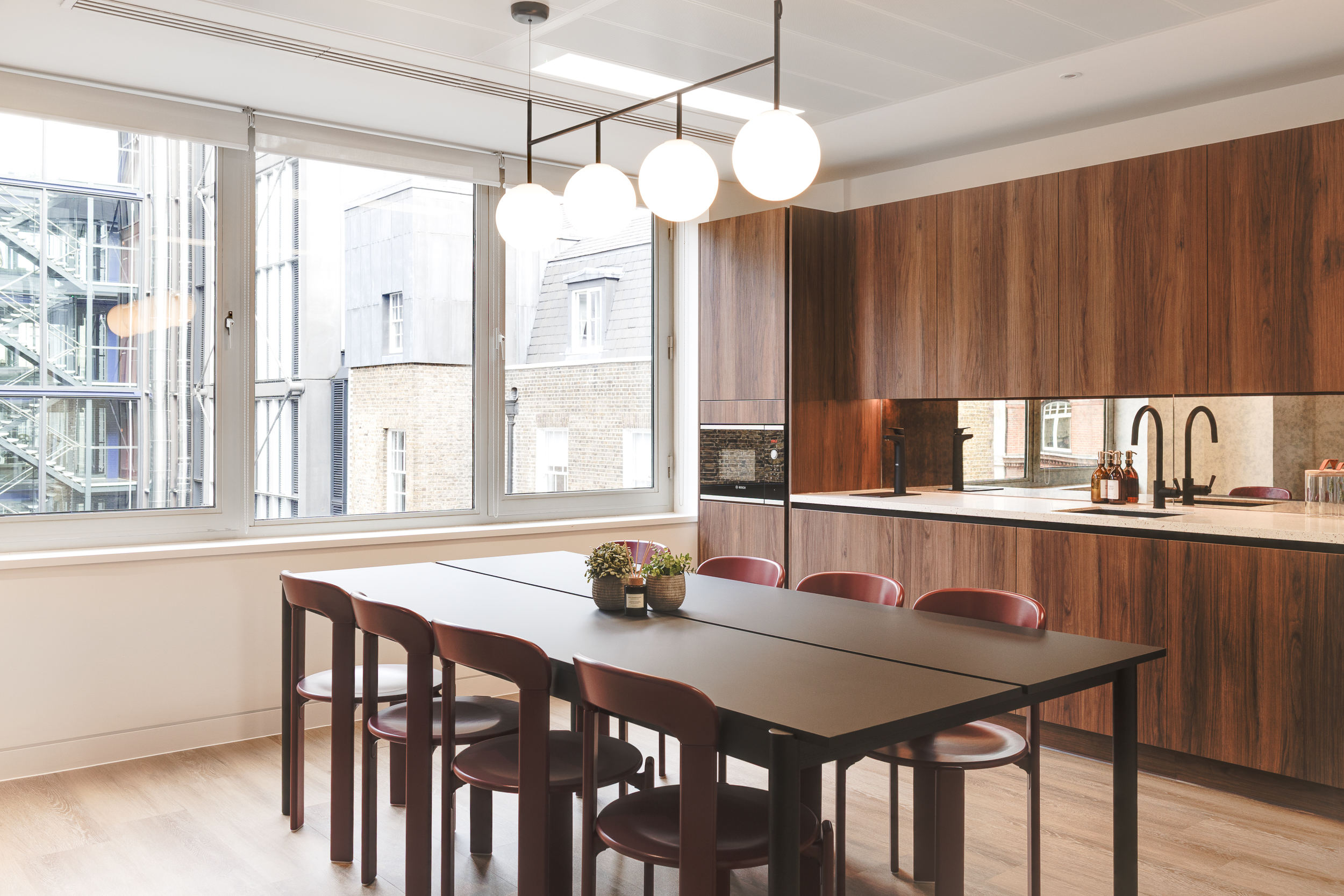 The teapoint became a deliberate focal point, designed as a functional hub with a personality. Cherry-red chairs inject vibrancy against walnut joinery, while a mottled mirrored splashback reflects light and movement across the room.